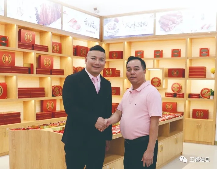 图为广东知名演员张鹏(左)和信宜市粤信肉类食品有限公司董事长彭胜光亲切握手。